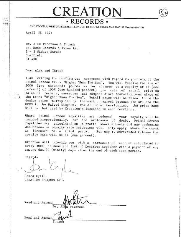 I am writing to confirm our agreement, with regard to your mix of the Primal Scream track “Higher Than The Sun”.