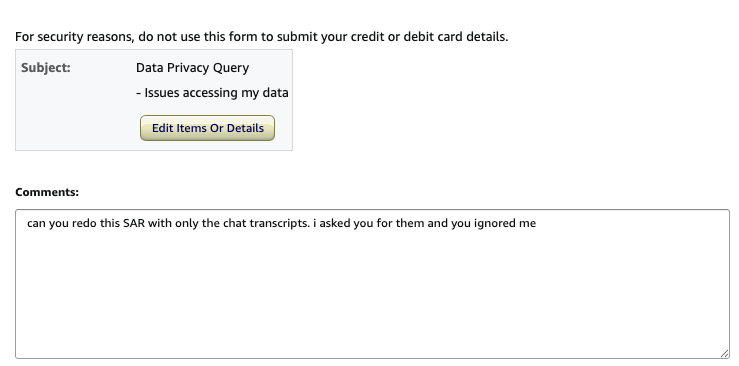 When asking for a SAR with that specific data they ignored me of course. They sent 100 folders of useless crap. Everything EXCEPT the evidence itself.